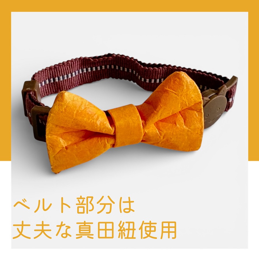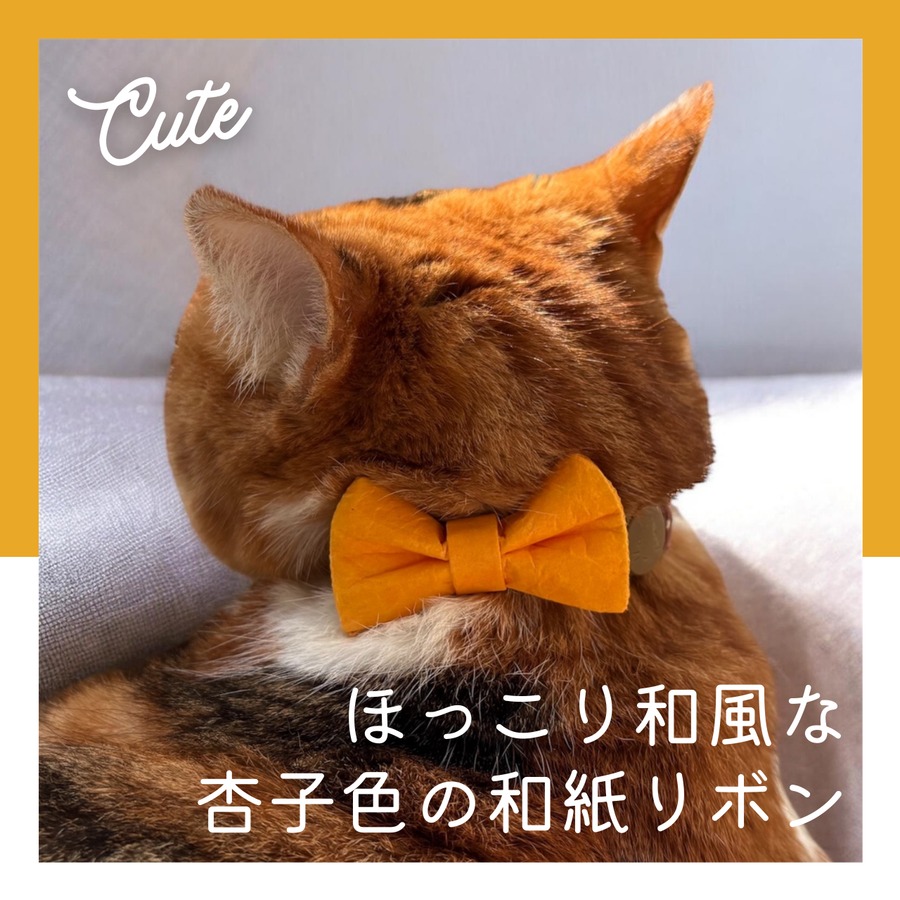 こちらは手すき和紙で仕立てた猫用首輪(あんず色)です。和紙ならではのやさしい風合いと、職人の手仕事が感じられる一品。ふんわりとしたあんず色は、白・茶・黒・キジトラなどどんな毛色の猫ちゃんにも自然に映え、写真映えも抜群です。