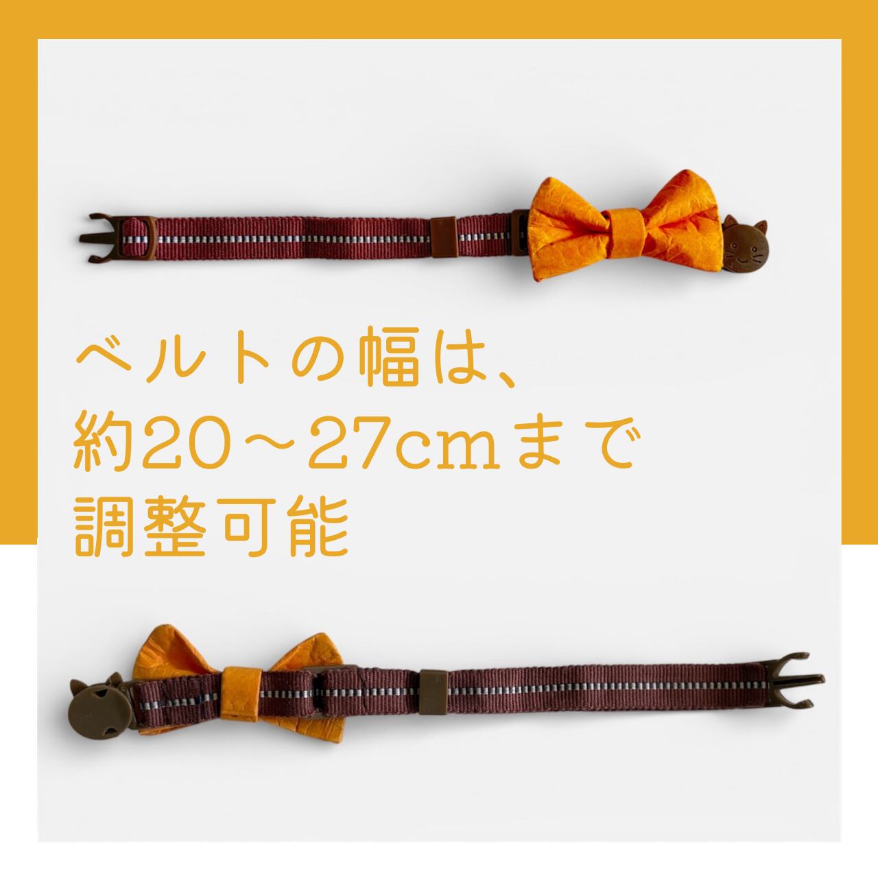 ベルト部分には、古くから日本で使われてきた丈夫な真田紐を採用。軽やかな着け心地ながら耐久性があり、猫ちゃんの動きを妨げません。サイズは約20~27cmまで調整可能で、成猫さんにちょうどよい仕様です。