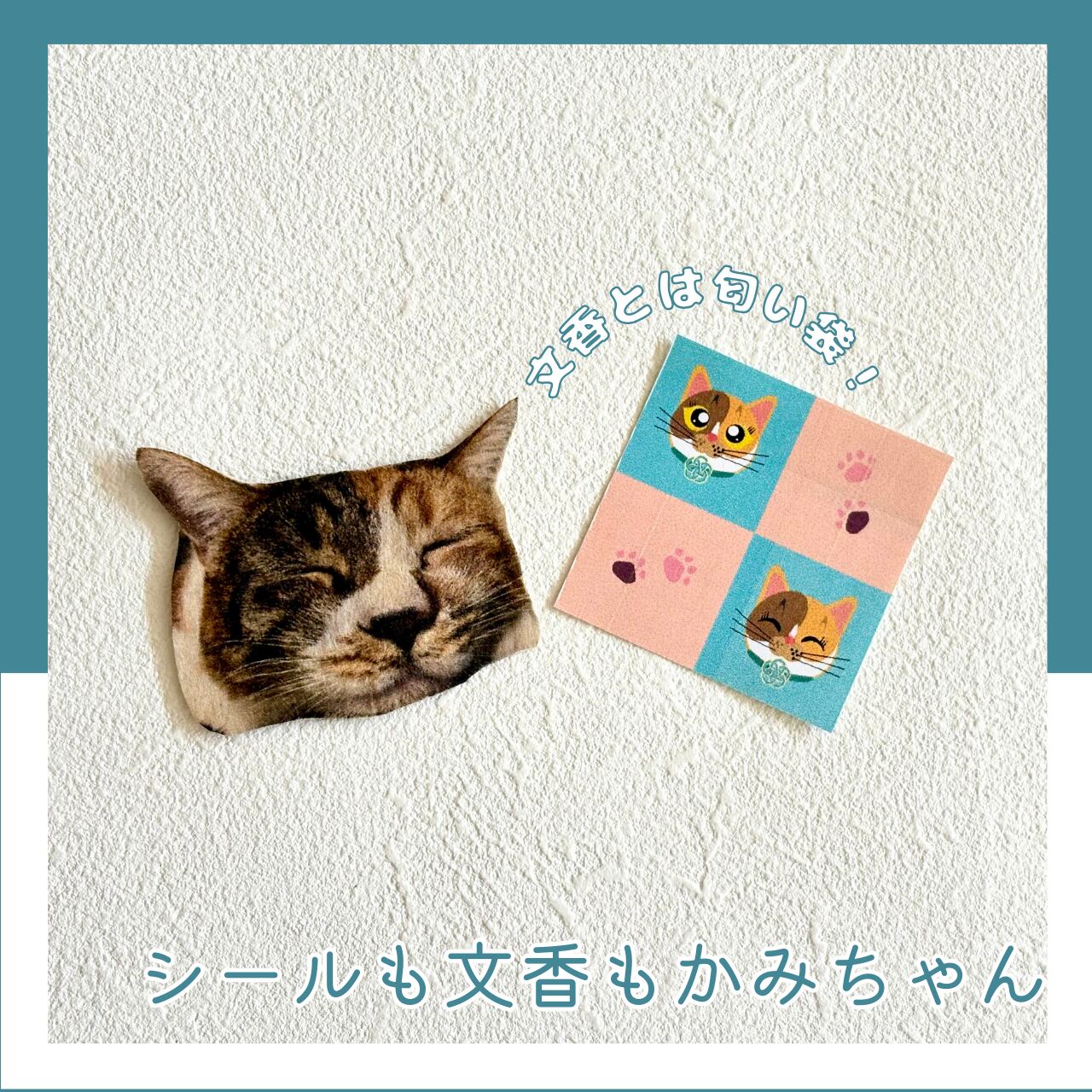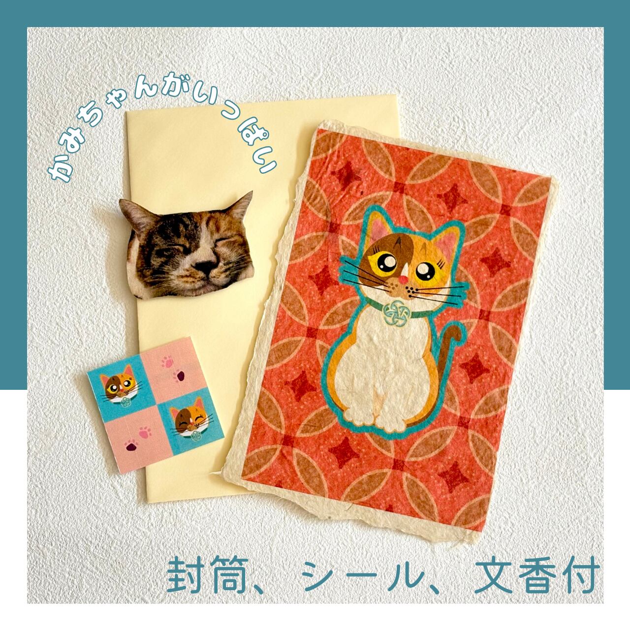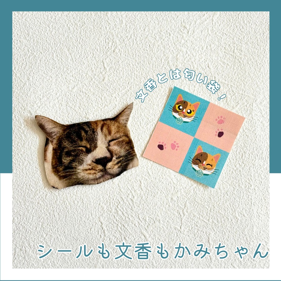 ポストカードだけでなく、カードを入れる封筒、かみちゃんが描かれたシール、そしてかみちゃんの顔型の文香がセットになった商品です。
