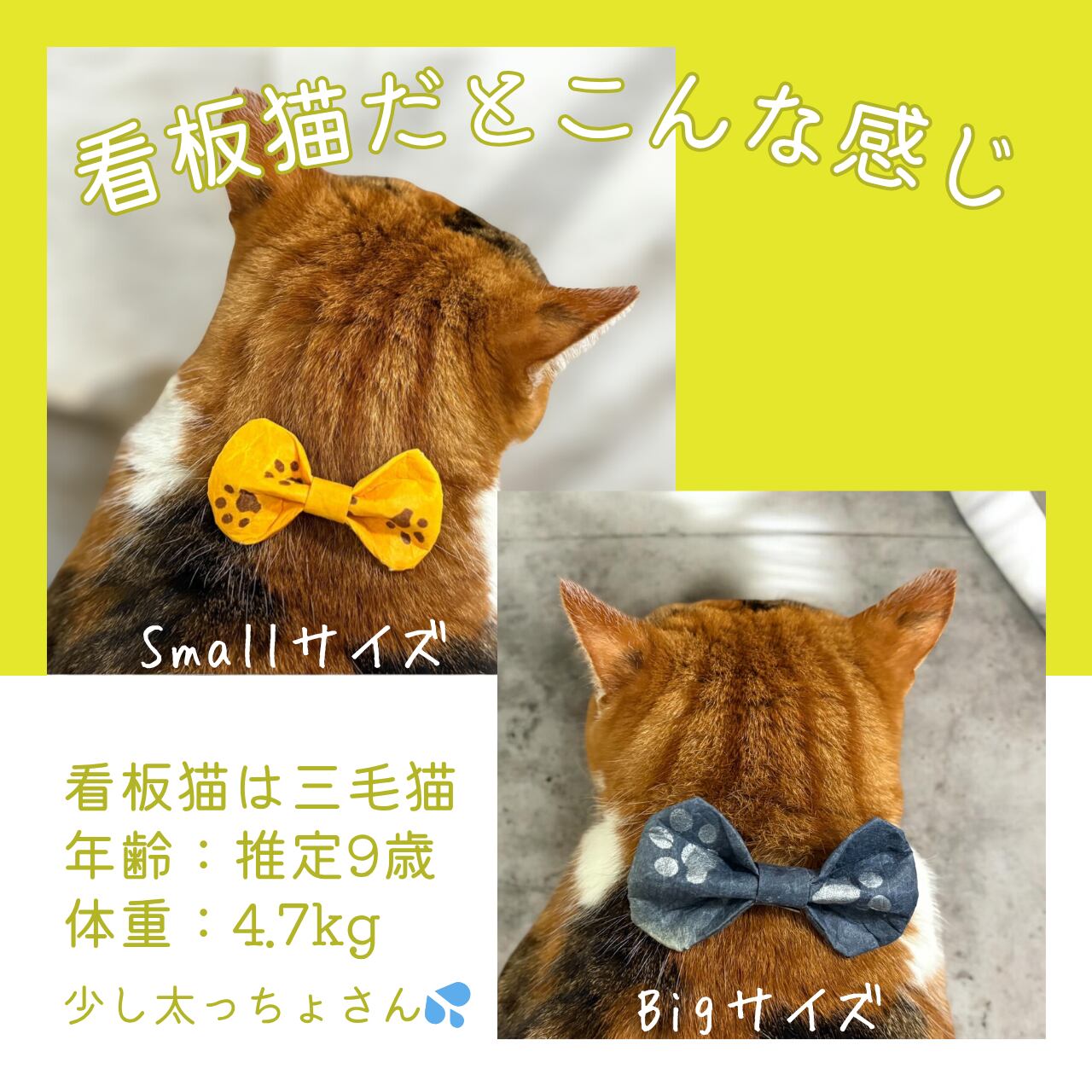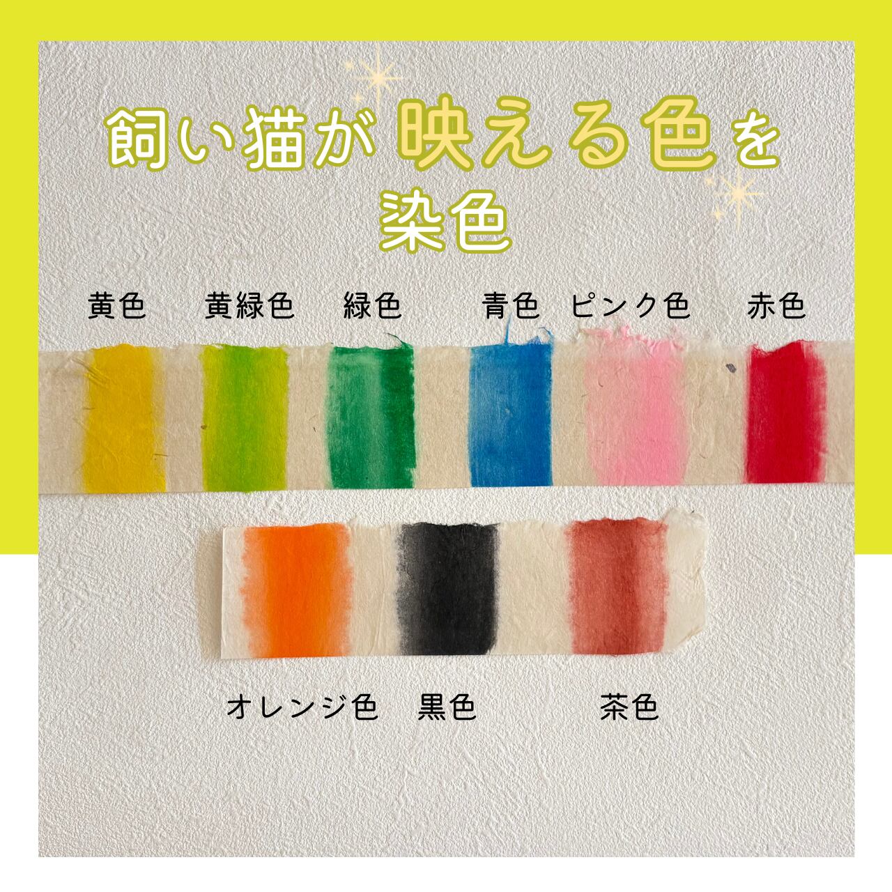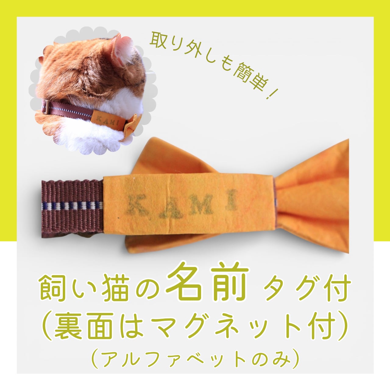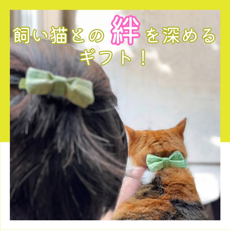 リボンの色は、猫ちゃんの毛色や目の色に合わせて選べる豊富なバリエーションをご用意しました(黄色、緑色、青色、ピンク、赤、オレンジ、黒、茶色など)。