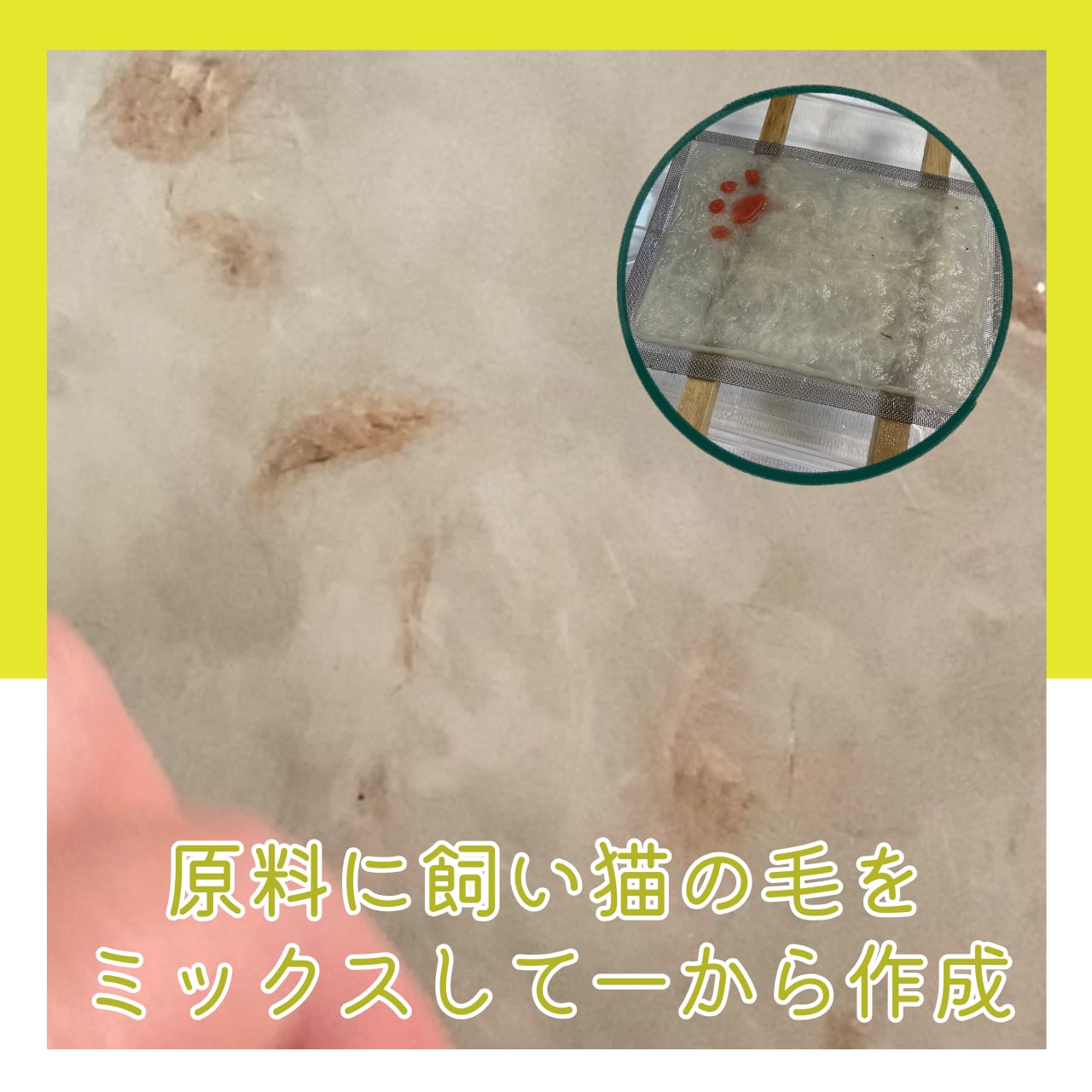 お送りいただいた愛猫の抜け毛を、伝統的な和紙の製法で手作業で漉き込みます。